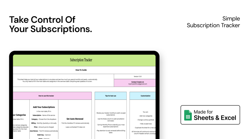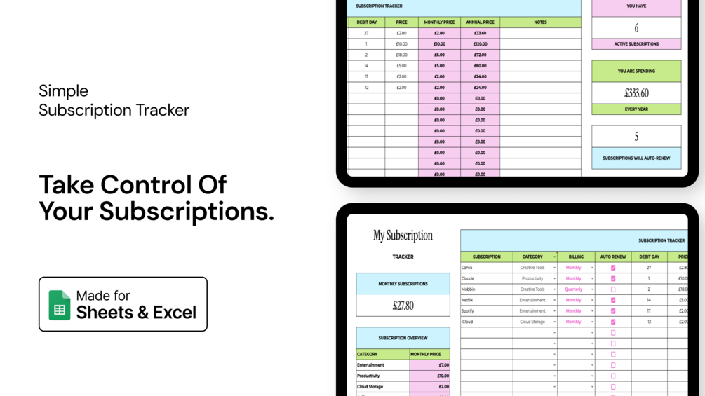 This Google Sheets Subscription Tracker helps you track all your recurring subscriptions in one place and instantly see how much you’re spending monthly and yearly—no manual calculations needed.